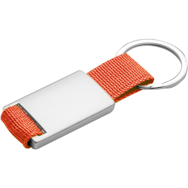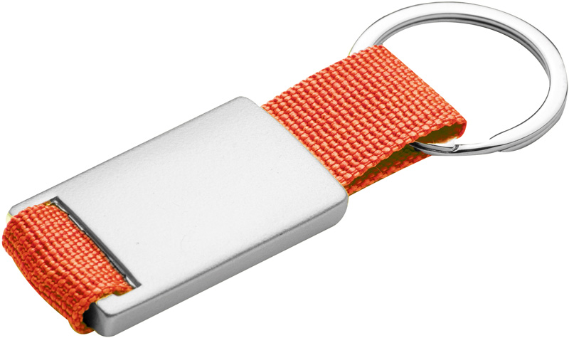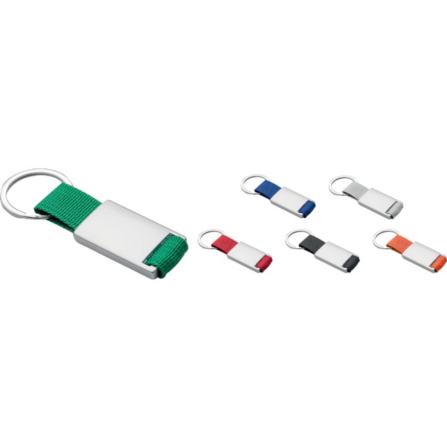 Portachiavi ad anello piatto, in metallo cromato e poliestere colorato. Confezione in scatola.