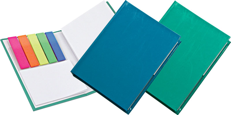 Portafoglietti in cartoncino blu, dotato di memo da 100 fogli e 20 fogli bianchi con segnaposto adesivi. Questo accessorio è utile per organizzare appunti e note, rendendolo un elemento pratico per ogni scrivania.