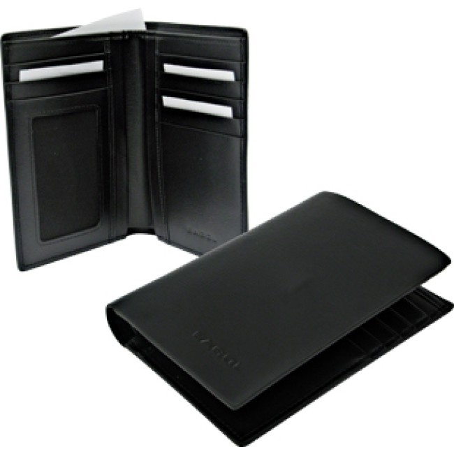 Portafoglio "Eagol" in pelle pieno fiore nera, lavorazione taglio vivo. Sette portacarte di credito, portapatente, portabanconote doppio scomparto. Confezione in astuccio rigido fondo e coperchio e vellutino.