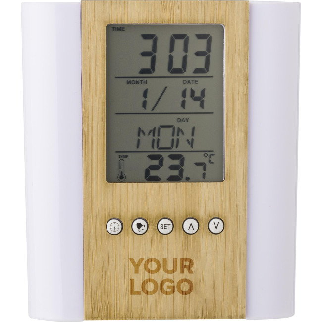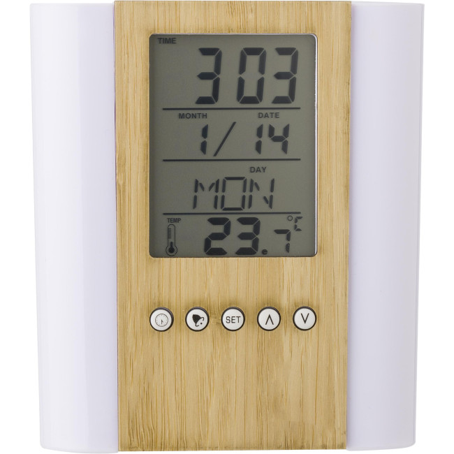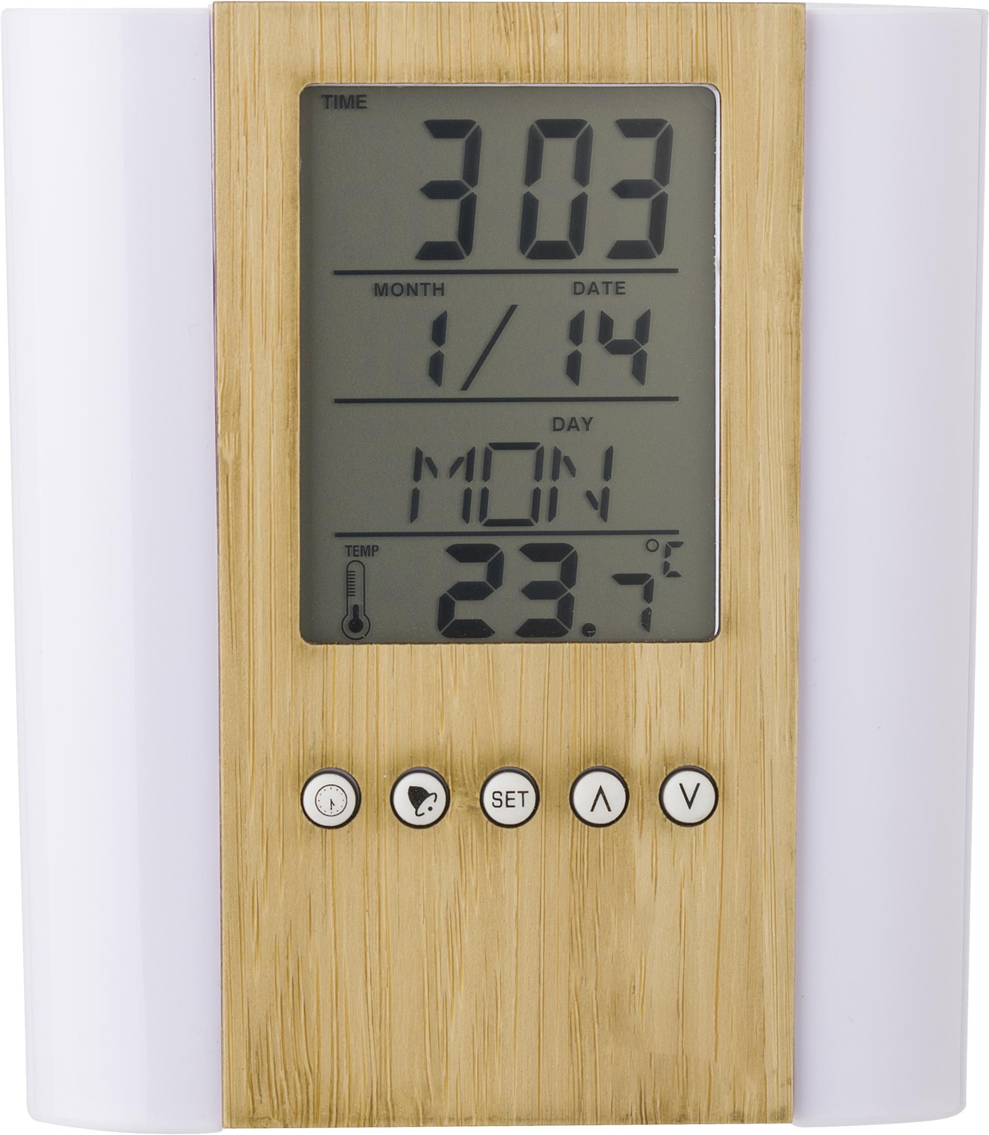 Portapenne in bamboo e plastica da tavolo, con orologio multifunzione con diverse funzioni come l'ora, termometro per interni, calendario (giorno, data, mese), sveglia e ripetizione, timer, promemoria compleanno, batterie incluse