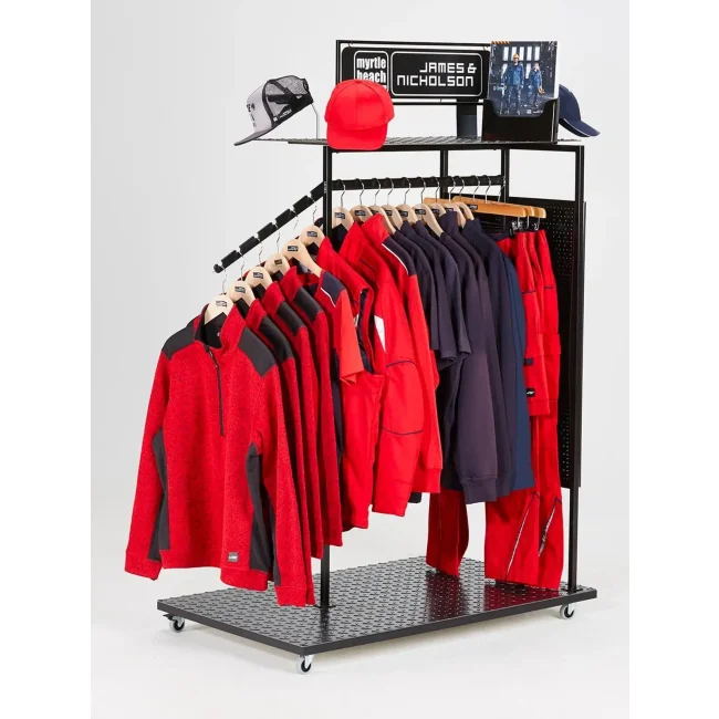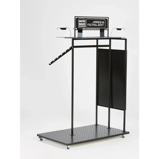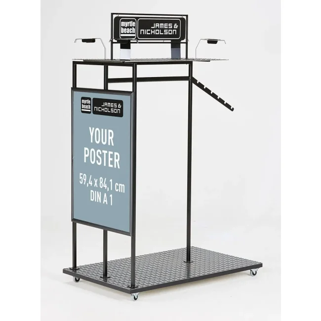 Appendiabiti classico con braccio laterale. Insegna in alto con il logo del marchio su entrambi i lati. Comoda cornice piegevole per poster A1. Spedito insieme a 4 fermagli e un porta-catalogo in plastica. Peso: ca 90kg. Dimensioni: 1,150mm x 700mm x 1,550mm