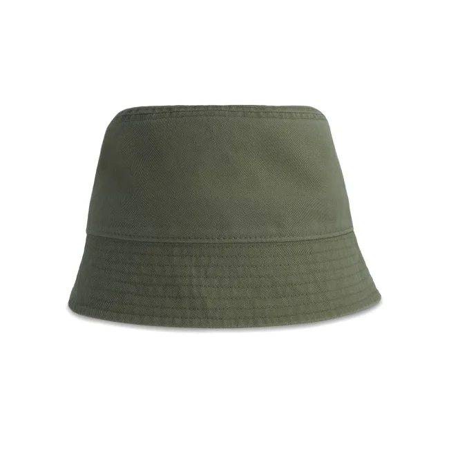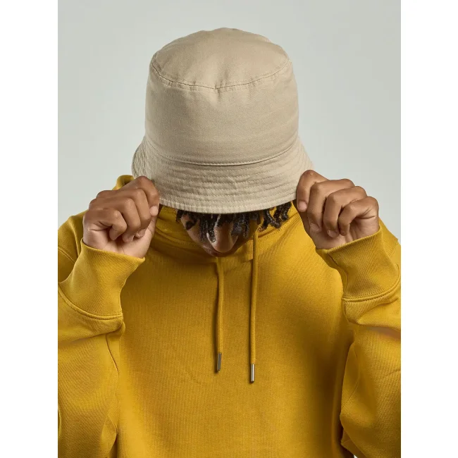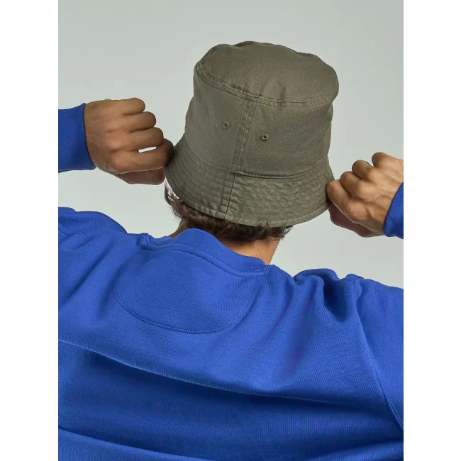 60% poliestere riciclato certificato 40% cotone twill. Cappello modello pescatore con tesa corta e spiovente. Modello ripiegabile e tascabile. Due occhielli sul retro per una maggiore ventilazione. Etichetta removibile.