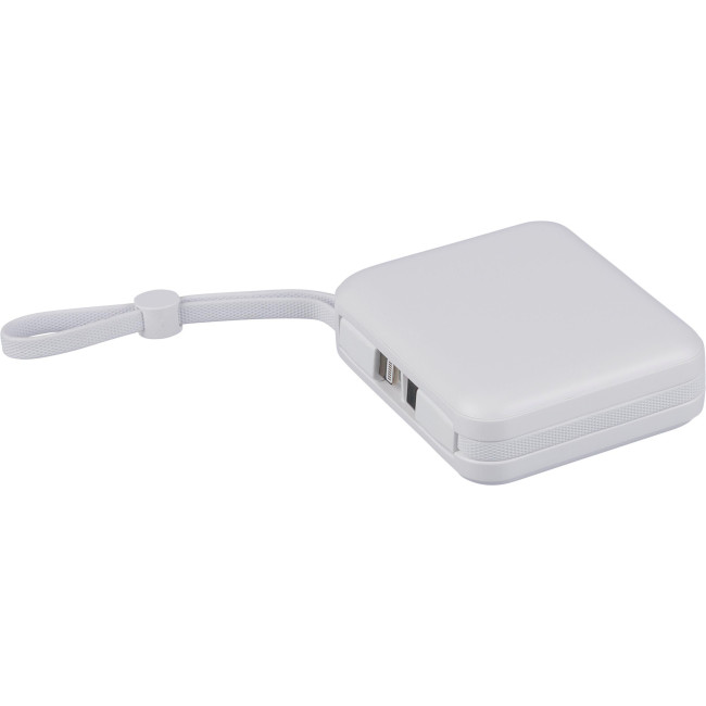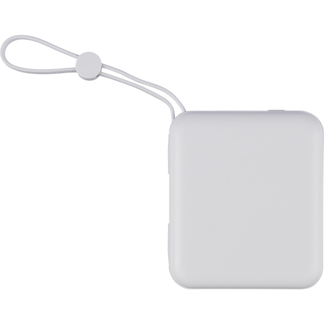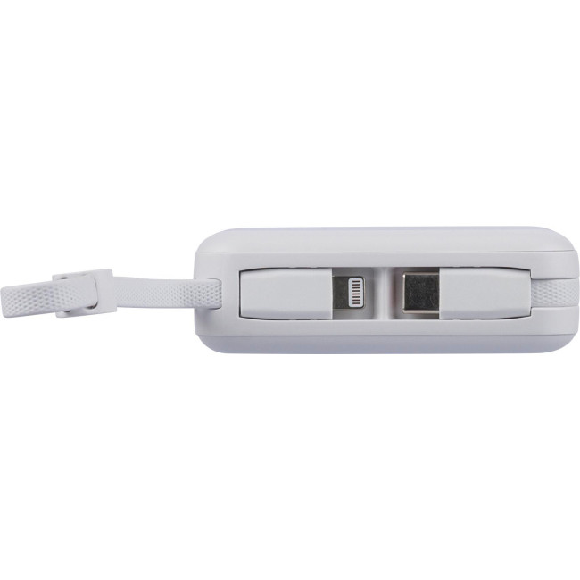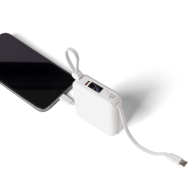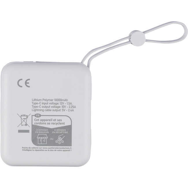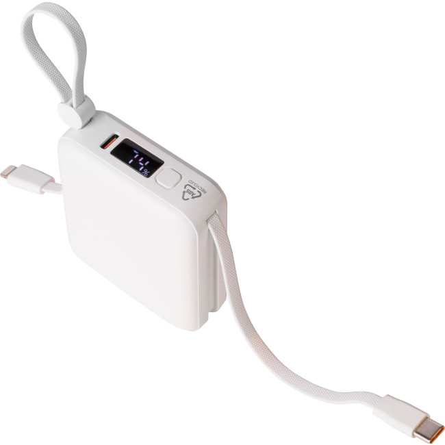 Powerbank in ABS riciclato con batteria Li-ion da 10.000?mAh e uscita di ricarica rapida da 22,5W, dotato di un cordino in TPE integrato che funge anche da cavo di ricarica con connettori Lightning e Type-C. Dispone di un display digitale LED sulla parte superiore per indicare la capacità residua della batteria, include ingresso/uscita Type-C e ingresso Type-A. Fornisce protezione contro surriscaldamento, cortocircuito, sovratensione e sovracorrente e presenta un'etichetta con il logo "ABS riciclato" sul retro. Confezionata singolarmente in una scatola in cartone avana avvolto in carta velina all'interno.