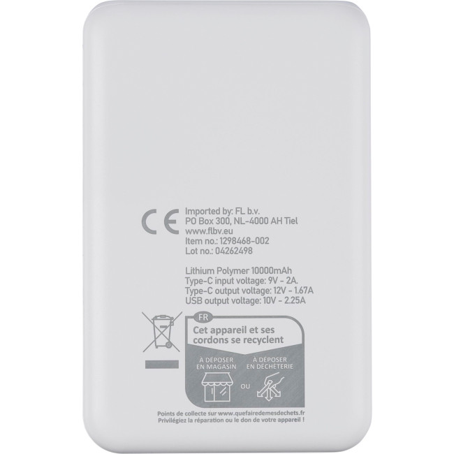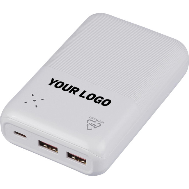 Powerbank in ABS riciclato con batteria Li-ion da 20.000?mAh e ricarica rapida da 22,5W, dispone di ingresso/uscita Type-C, ingresso Type-A e indicatore LED per lo stato della batteria, dotato di protezioni contro surriscaldamento, cortocircuito, sovratensione e sovracorrente, include etichetta sul retro con il logo ABS riciclato. Confezionata singolarmente in una scatola in cartone avana avvolto in carta velina all'interno.