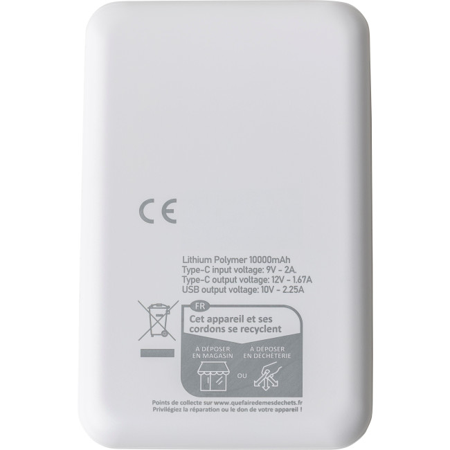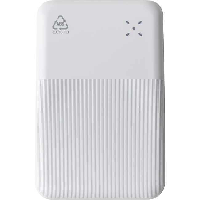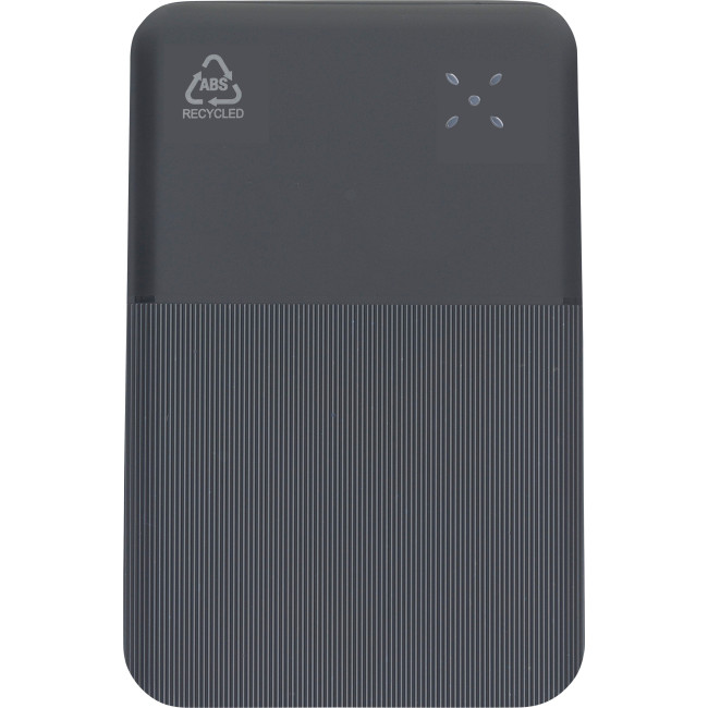 Powerbank in ABS riciclato con batteria Li-ion da 10.000?mAh e ricarica rapida da 22,5W, dispone di ingresso e uscita Type-C, e ingresso Type-A. Il design del corpo presenta un terzo con superficie liscia lucida per la stampa e due terzi con texture a rilievo, è dotato di display digitale sulla parte superiore per mostrare la capacità della batteria. Offre protezione contro il surriscaldamento, cortocircuito, sovratensione e sovracorrente ed include un’etichetta sul retro con il logo "ABS riciclato". Confezionata singolarmente in una scatola in cartone avana avvolto in carta velina all'interno.