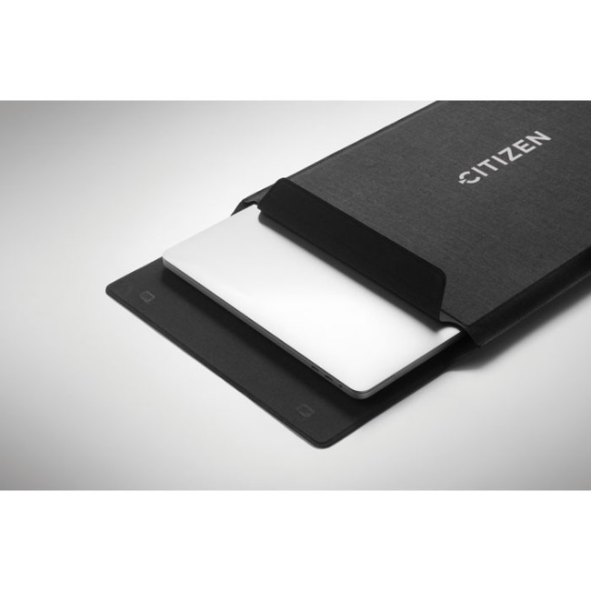 Custodia per laptop RPET da 16 pollici con supporto per laptop e funzionalità di tappetino per mouse quando è aperta.