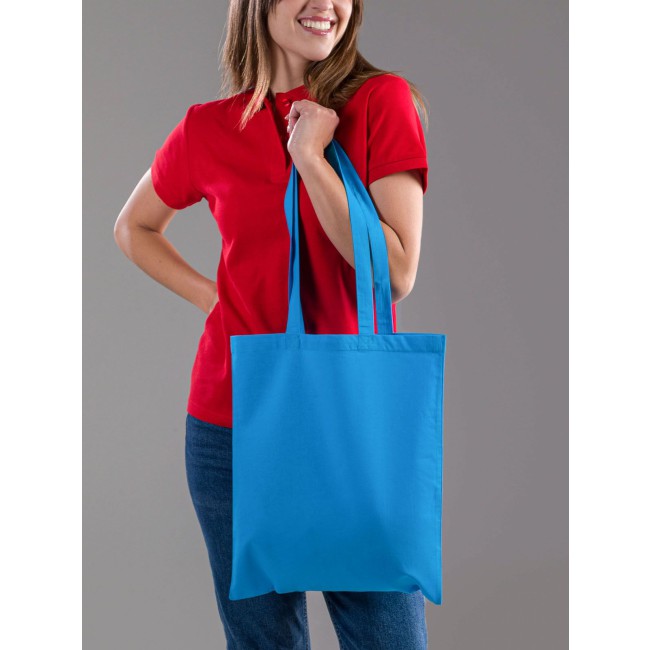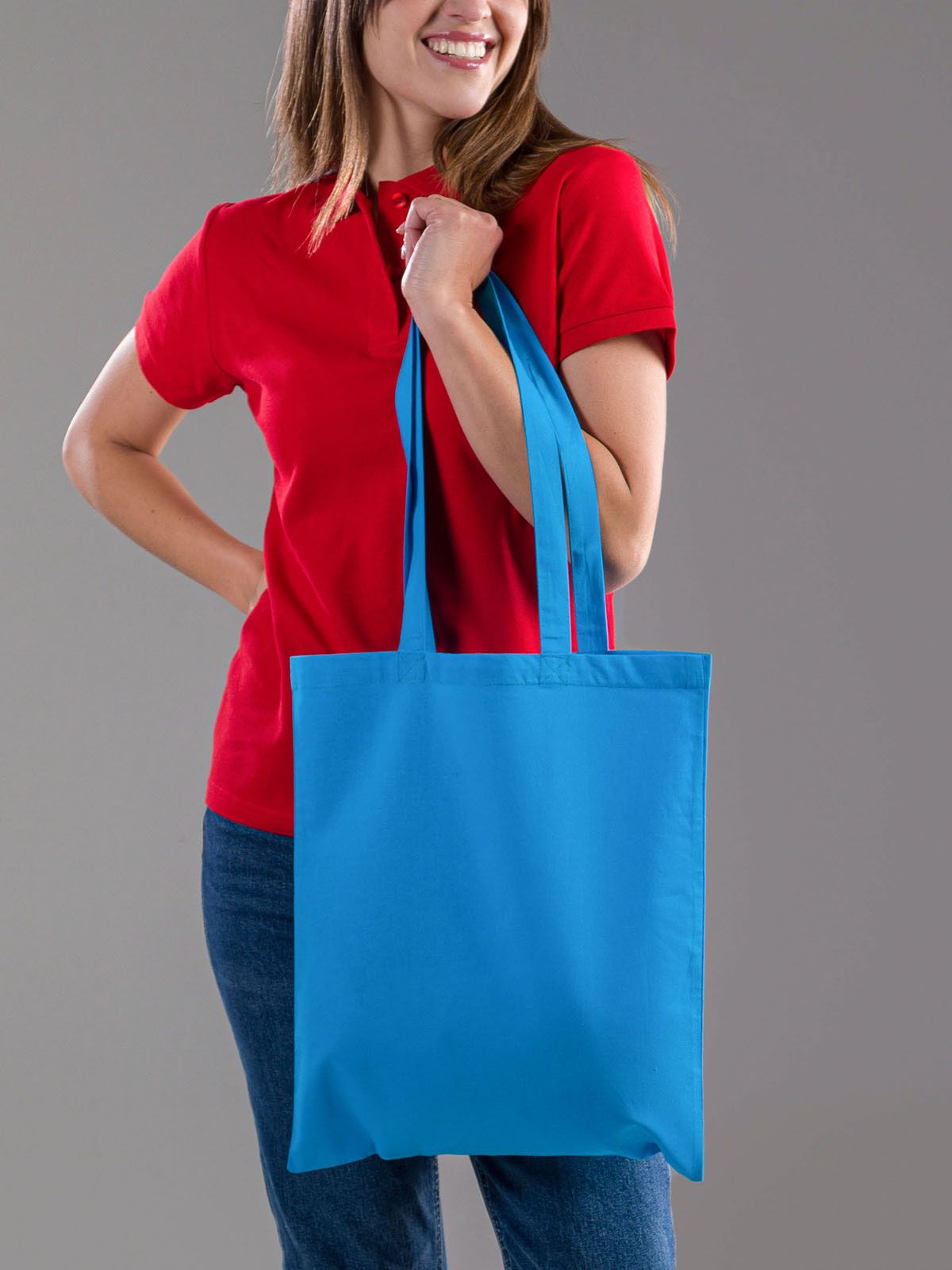 100% cotone. Shopper con manico lungo 67 cm. Prodotto stirato per una migliore stampabilita'. Etichetta removibile. Dimensione: 38X42 cm. Area stampabile: 28X34 cm.