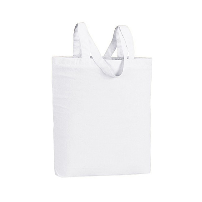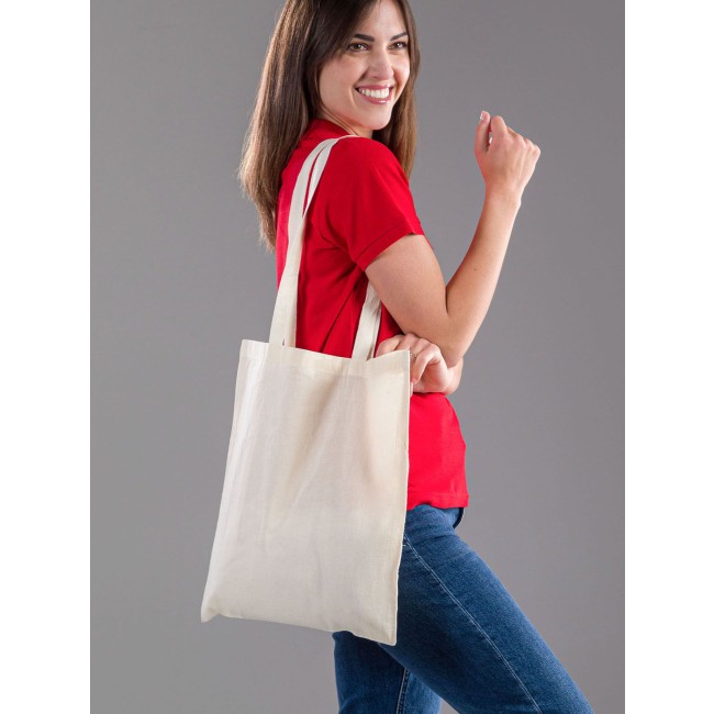100% cotone. Shopper manico lungo cm 67. Prodotto stirato per una migliore stampabilita'. Etichetta removibile. Dimensione: 38X42 cm. Area stampabile: 26X30 cm.