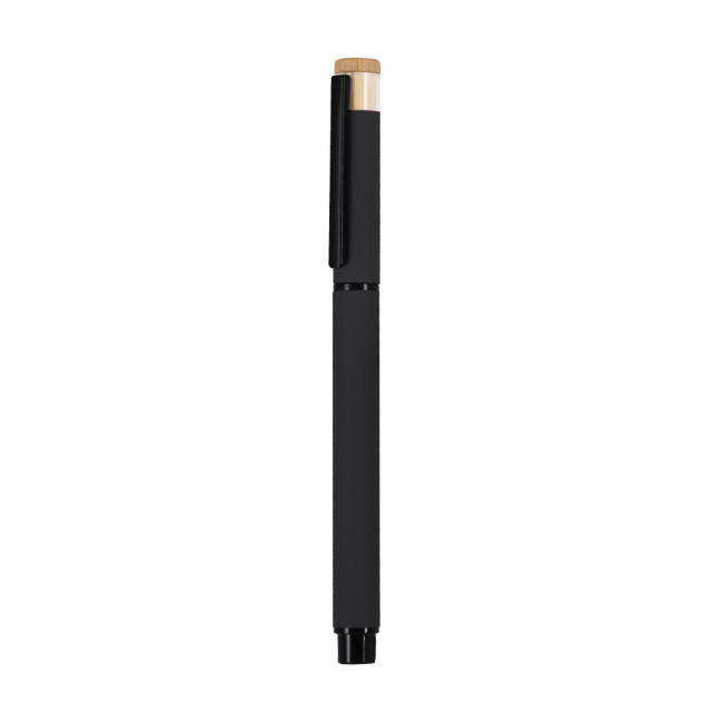 Elegante rullo fatto di bambù e alluminio riciclato. Con una carrozzeria con finitura gommosa. Clip e impugnatura nere. Con cartuccia jumbo, inchiostro blu e chiusura del cappuccio. Con il distintivo logo di Recycled Aluminium.