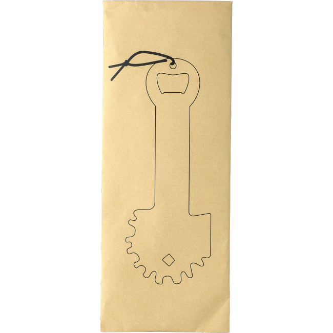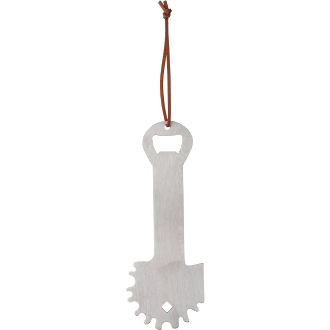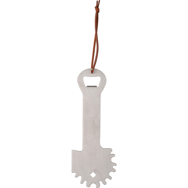 Pulitore per barbecue in acciaio inox con apribottiglie integrato. Dotato di cordino in PU per una comoda sospensione e facile conservazione. Confezionato singolarmente in una custodia di carta kraft.