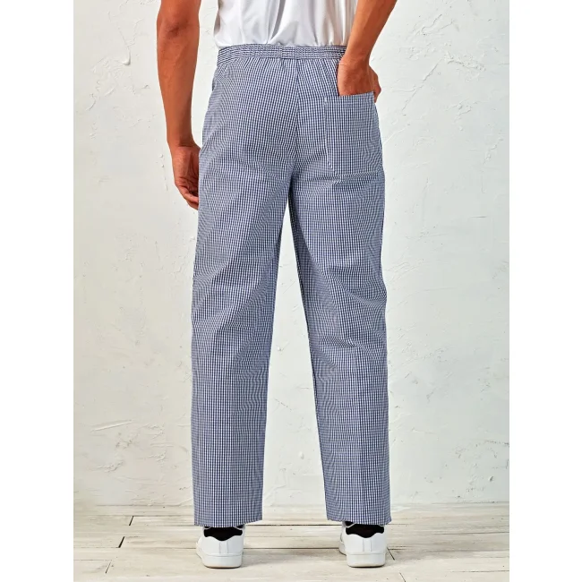 65% poliestere, 35% cotone. Pantaloni da chef in tessuto easy care, vita elasticizzata, taglie unisex, tasca posteriore applicata, chiusura lampo. Lavabile a 60°C.