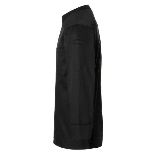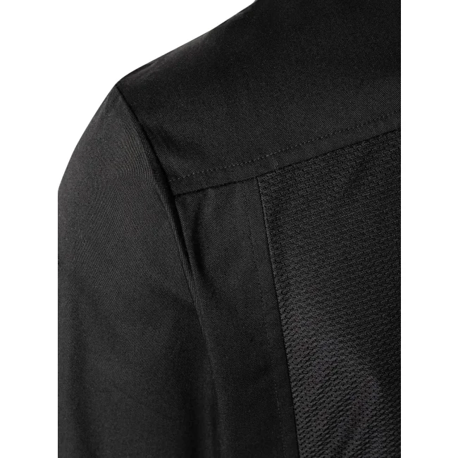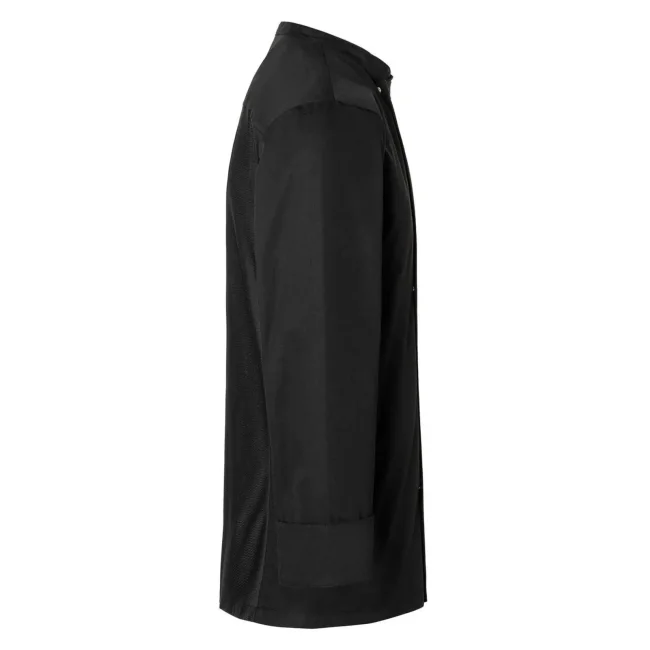 65% poliestere, 35% cotone lato anteriore, 100% poliestere lato posteriore. Camicia moderna da cucina a maniche lunghe da usare su altri indumenti, con inserto sul retro in tessuto Jersey a rete che garantisce libertà di movimento e traspirabilità, taglio diritto, bottoni a pressione nascosti che possono aumentare la circonferenza della camicia una volta aperti, un taschino a filetto sul lato sinistro del petto e uno sulla manica sinistra. Lavaggio a 60°C.