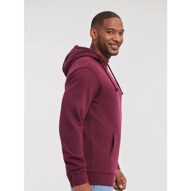 100% Cotone organico (OCS 100). Felpa a collo alto con cappuccio, sgarzata, tasche a filetto dello stesso tessuto, elastane su polsini e girovita, doppia cucitura per una resistenza perfetta, cordoncini in 100% cotone robusto, piccola etichetta senza logo sul collo.