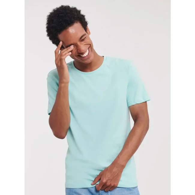 100% Cotone ring-spun organico. T-shirt da uomo con nastro di rinforzo spalla-spalla, fascia del colletto in lycra, cuciture laterali, vestibilità sagomata. (Col. LX 97% cot 3% visc.)