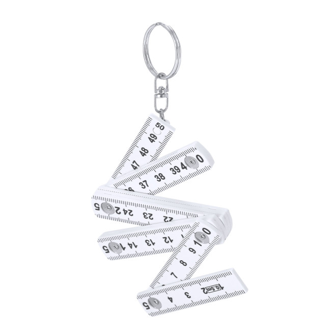 Portachiavi righello pieghevole da 50 cm in ABS resistente con anello metallico girevole. Scala in centimetri nera visibile su entrambi i lati. Posizioni regolabili a 90º, 180º e 270º per maggiore versatilità.