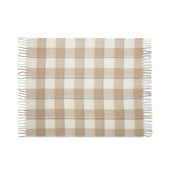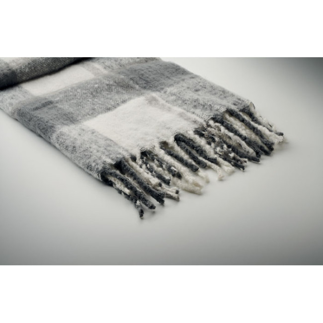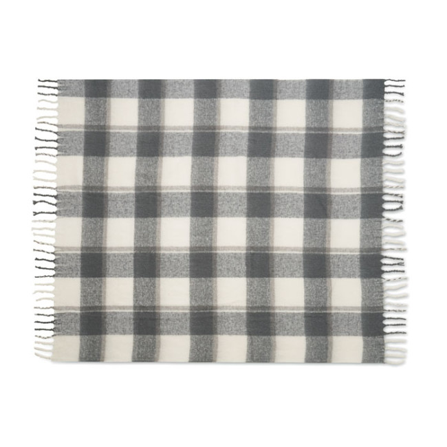 Coperta in RPET poliestere mohair dal disegno quadrettato con frange arrotolate a mano. Avvolto in nastro e cartoncino stampabile.