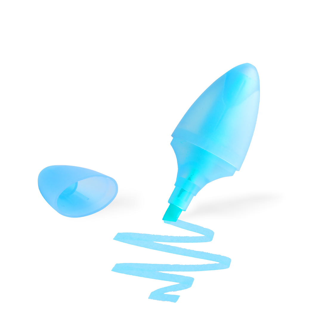 Evidenziatore dal design minimalista in colori divertenti, con fusto e cappuccio in finitura semitrasparente.