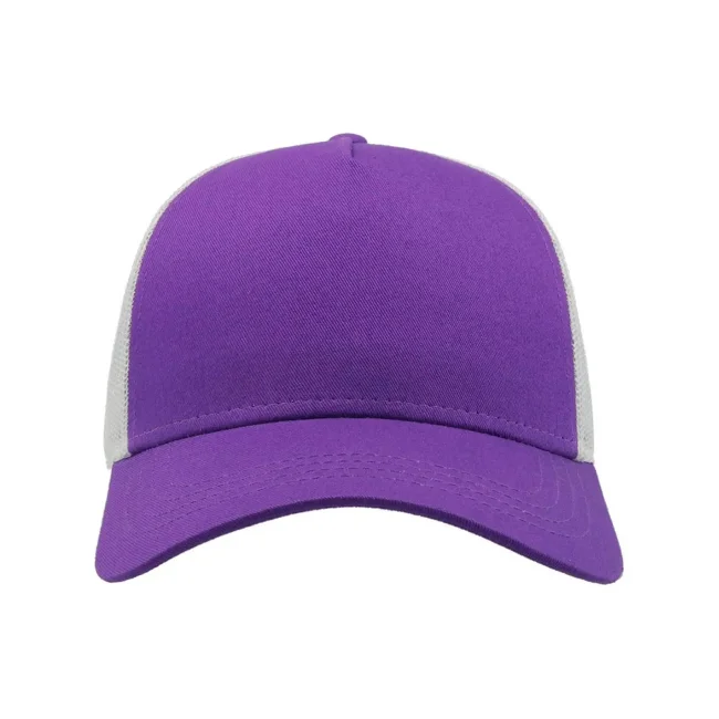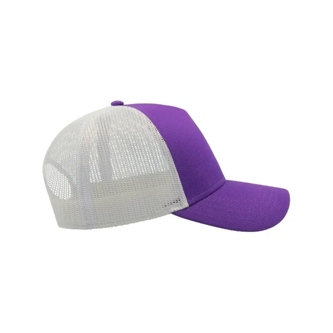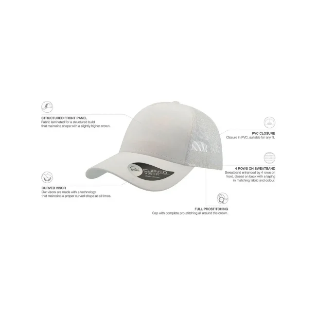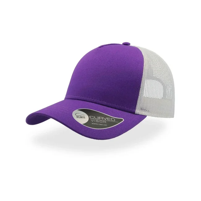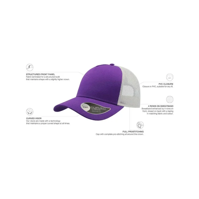 Pannello frontale e visiera 100% cotone, altri pannelli: 100% poliestere. Cappellino a 5 pannelli, mesh posteriore e laterale, pannello frontale rinforzato, visiera pre-curvata, chiusura in pvc, ideale per la stampa, 4 cuciture su visiera, etichetta removibile, taglia unica. Nuovo codice: ATRACS