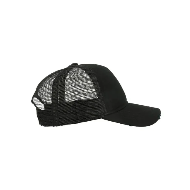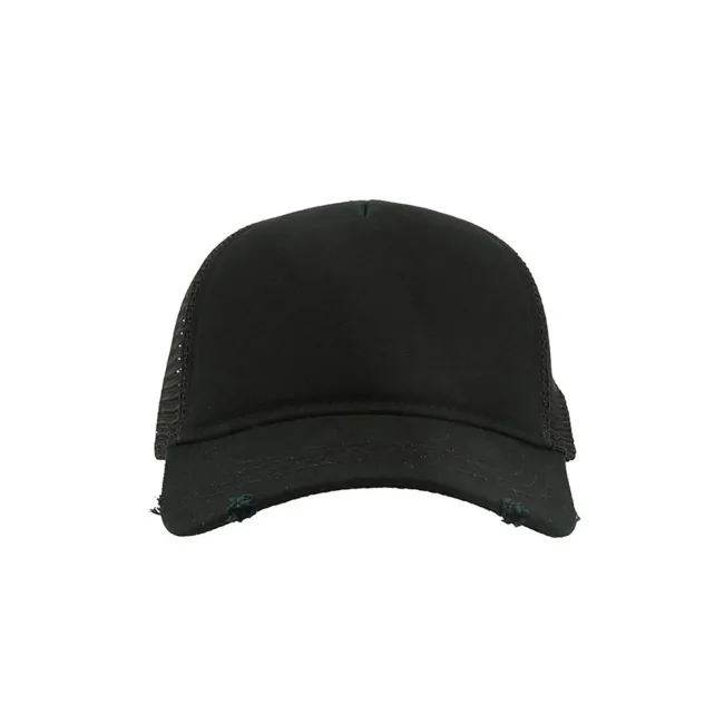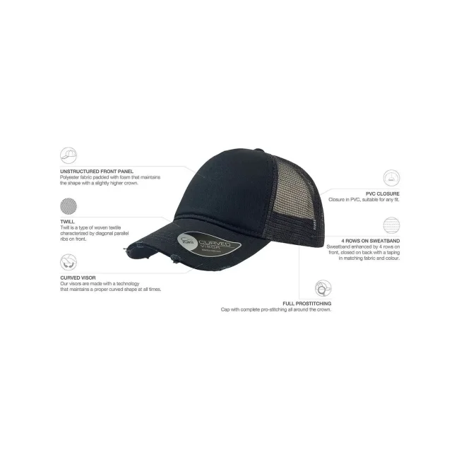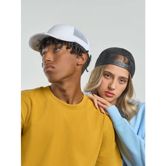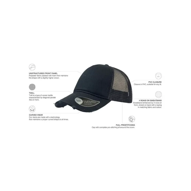 100% cotone. Trucker cap a 5 pannelli, mesh posteriore e laterale, visiera destroyed pre-curvata, pannello frontale non strutturato, ideale per la stampa, 4 cuciture su visiera, parasudore in cotone, etichetta removibile.