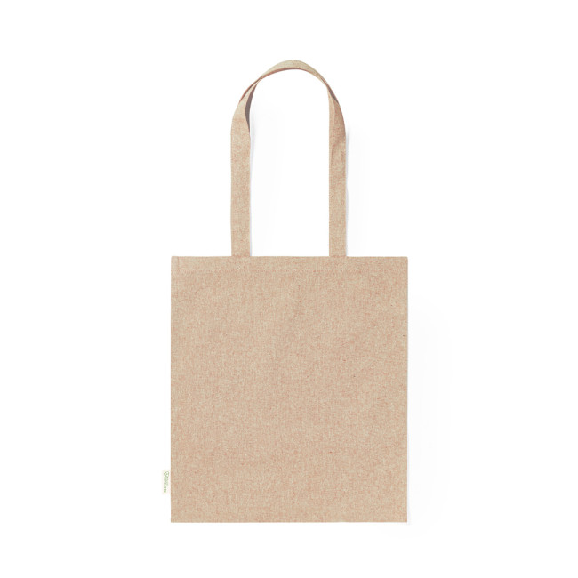 Borsa in materiale cotone riciclato 140g/m2. Certificazione GRS (Global Recycled Standard), che garantisce che i tessuti utilizzati per l’articolo siano derivati da fibre organiche. Finitura cucita, con manici rinforzati lunghi 70 cm e disponibili in una vasta gamma di colori. Resistenza fino a 8 kg, compresa l'etichetta in cotone riciclato.