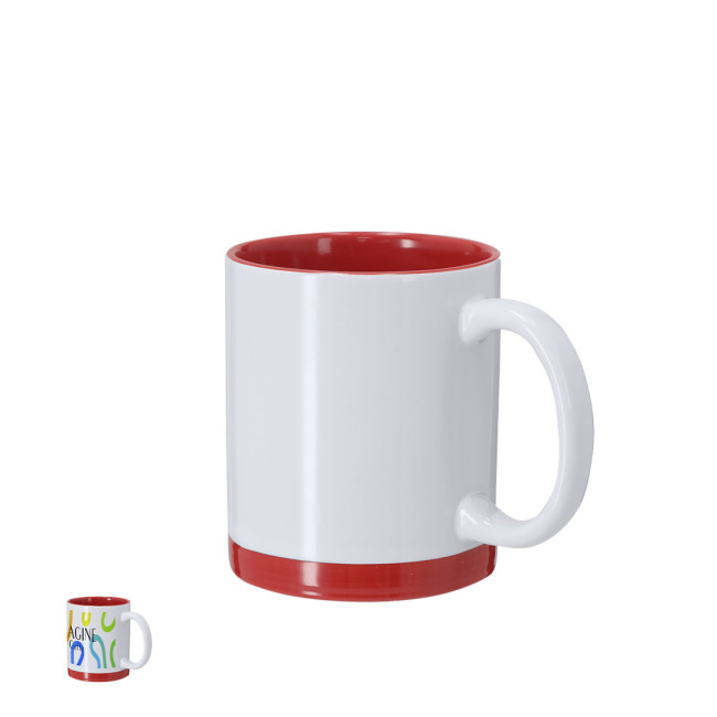 Tazza in ceramica con capacità di 350 ml, progettata con esterno bianco e dettagli colorati abbinati alla base e all'interno. Progettata specificamente per marcatura in sublimazione.