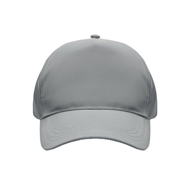 Cappellino da baseball a 5 pannelli in poliestere 190T altamente riflettente. 4 occhielli cuciti con chiusura a gancio e anello. Taglia 7 1/4.