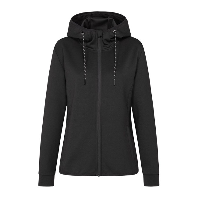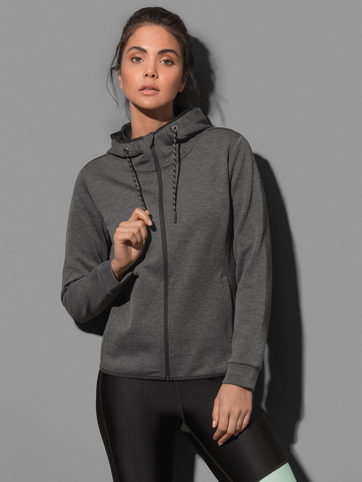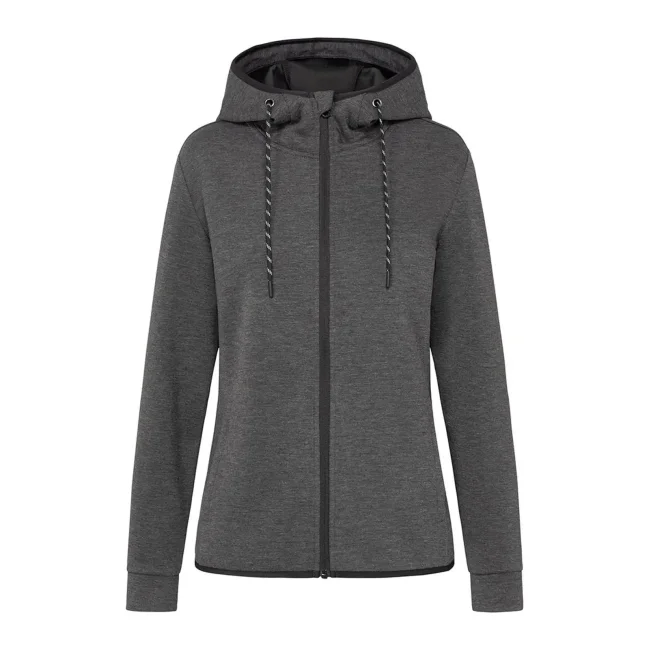 94% poliestere 6% elastan. Giacca con cappuccio da donna, tessuto funzionale eco-compatibile, prodotta con 8 bottiglie di plastica riciclate per giacca, cappuccio tipo ""sub"" con bordatura elastica e cordoncino bicolore, occhielli in metallo per cordino (senza nichel), 2 tasche laterali con cerniere nascoste, cerniera con chiusure lampo in metallo (senza nichel), cuciture di finissaggio flatlock, bordatura elastica sull'orlo della vita, orlo nello stesso materiale, nastro di rinforzo, cuciture laterali, etichetta della taglia intessuta nel colletto, etichetta di manutenzione a strappo nella cucitura laterale, lavabile a 40°C. "BLO: 94% poliestere (24% riciclato), 6% elastan, ANH: 81% poliestere (28% riciclato), 13% viscosa, 6% elastan