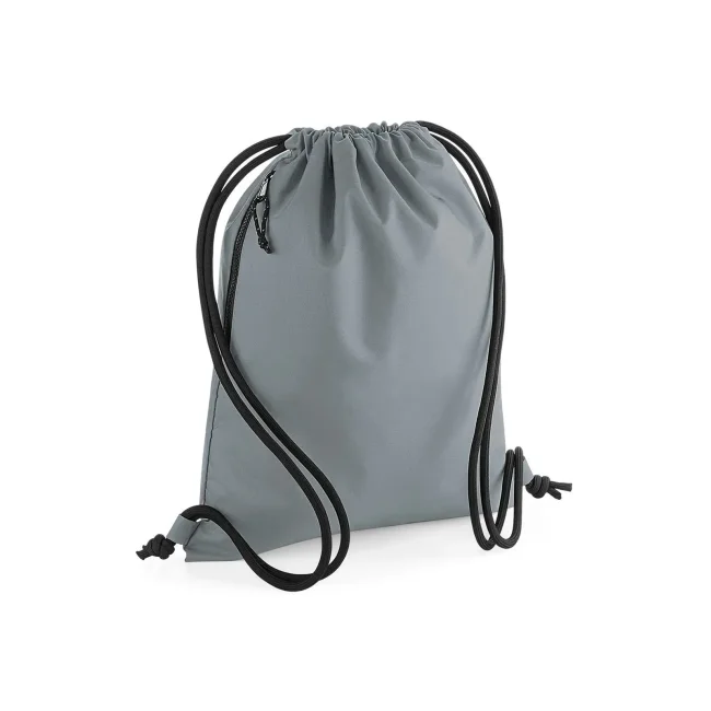 100% Poliestere 300D Riciclato. Gymsac con etichetta removibile TearAway per cambiare più facilmente il marchio, tasca con cerniera, anelli in tessuto per facilitare la decorazione, tirazip con cordino con dettagli catarifrangenti, coulisse con cordoncini spessi. Dimensioni: 40 x 48 cm. Capacità: 15 litri. Massima Area di stampa: 36x26 cm.