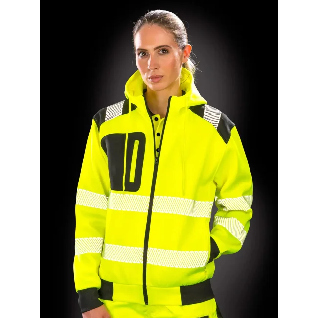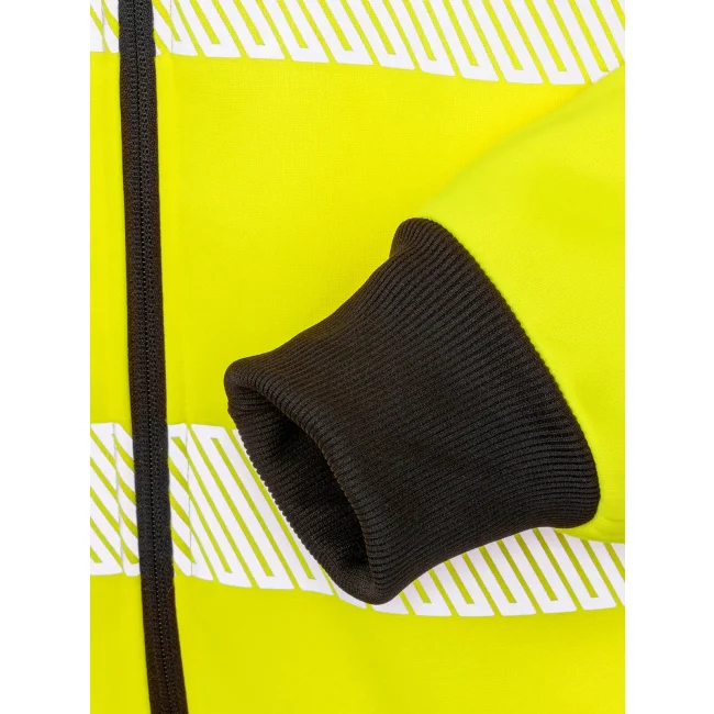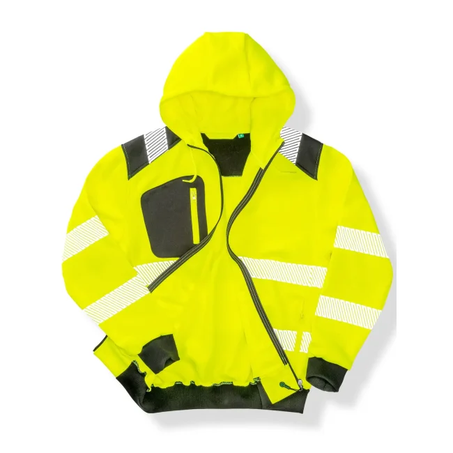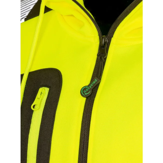 100% poliestere riciclato REPREVE. Costine: 100% pol. Felpa con cappuccio, traspirante ed elasticizzata, orlo inferiore e polsini elastici a costine, strisce di sicurezza stampate, zip frontale YKK, tasche frontali e sul petto con zip, felpata internamente, cappuccio con cordini. EN ISO 20471: 2013+A1:2016 Class 2.