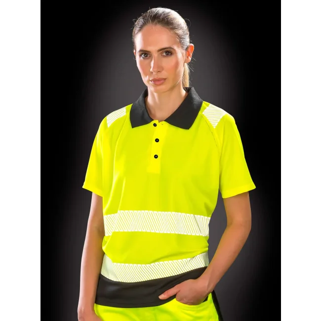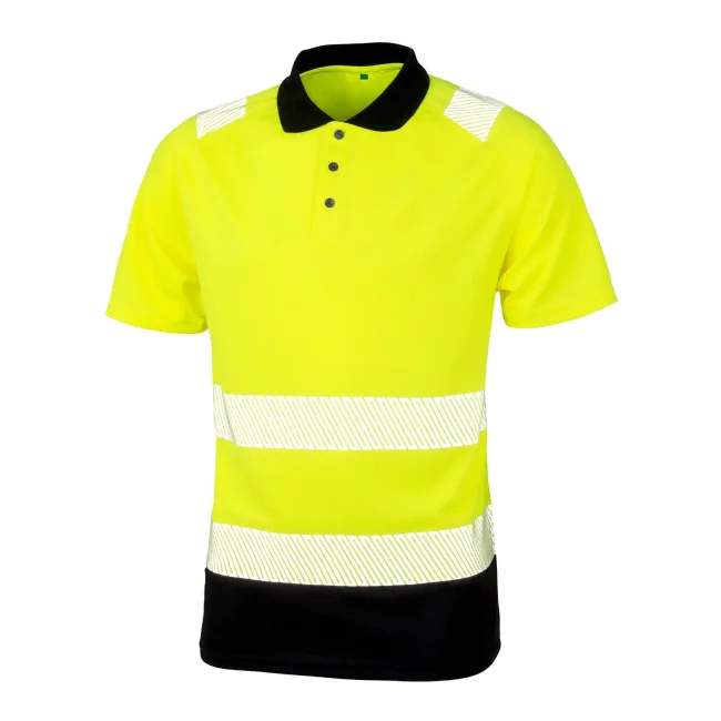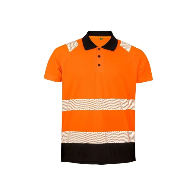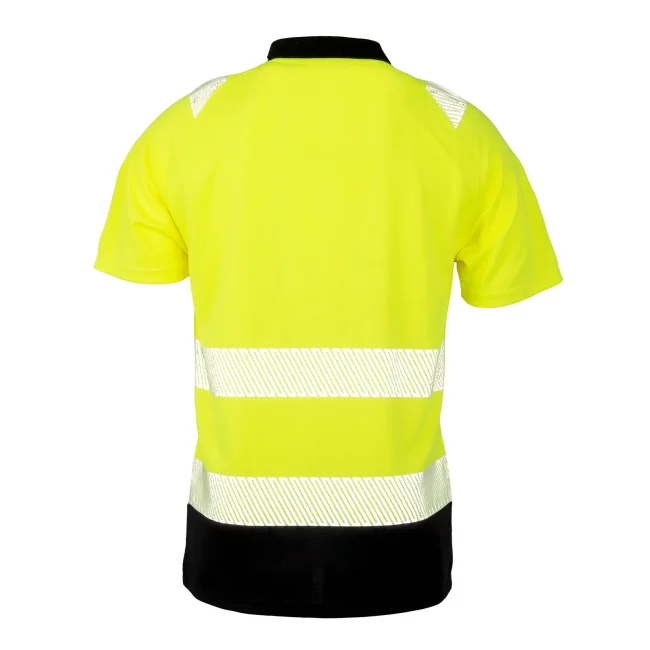 100% poliestere riciclato, colletto 100% poliestere. Polo di sicurezza elasticizzata e traspirante con dettagli riflettenti e strisce di sicurezza stampate, pattina a 3 bottoni, colletto elastico a costine, traspirante e ad asciugatura rapida, colletto e orlo inferiore neri. EN ISO 20471: 2013+A1:2016 Class 2.