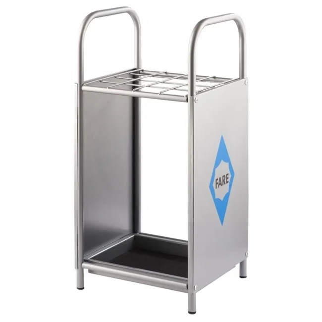 100% acciaio. Espositore per un massimo di 16 ombrelli regolari, telaio in alluminio, rivestimento color argento, chiusi ai lati e con logo FARE, montaggio incl. base antiscivolo. Larghezza: 26 cm, altezza: 60 cm, profondità: 29 cm.