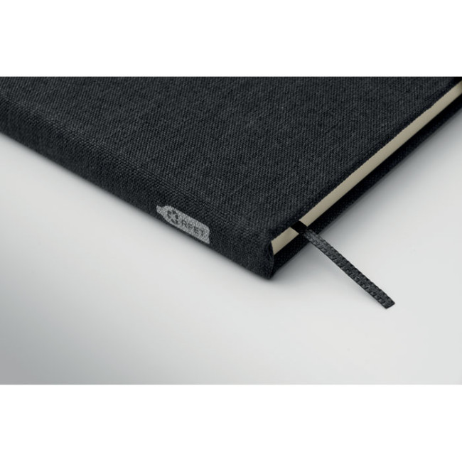 Notebook A5 con copertina rigida in RPET e funzionalità di supporto per il telefono. Penna a sfera integrata 2-in-1 senza inchiostro e normale in ABS. Rilegato con custodia. 192 pagine a righe in carta riciclata (96 fogli). Cinturino e segnalibro abbinati. FSC®-certified | FSC MIX CREDIT, P7.1, FSC-C213206