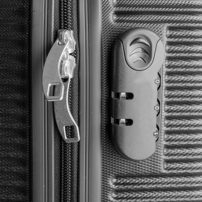 trolley/bagaglio a mano 4 ruote antigraffio ed antiurto in ABS manico telescopico maniglia a scomparsa chiusura con combinazione 3 cifre interno con cinghie ferma abiti scomparti con chiusure zip tecnica di stampa consigliata: serigrafica