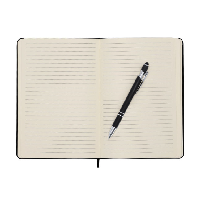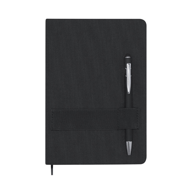 Blocco note A5 in elegante RPET. Copertine rigide con finitura in tessuto. Include fascia elastica sulla copertina, ideale per tenere il telefono, e portapenne elastico. Interno con 80 pagine a righe, segnalibro a nastro coordinato e tasca sul retro. Include penna con inchiostro blu, corpo in alluminio con finitura in gomma, clip metallica e meccanismo a pulsante. Logo RPET incluso.
