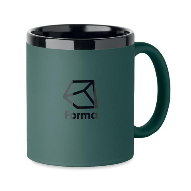 Tazza in ceramica con rivestimento soft touch e bordo interno nero. Per il laser. Capacità: 300 ml. Confezionata singolarmente in scatola di cartone bianca.