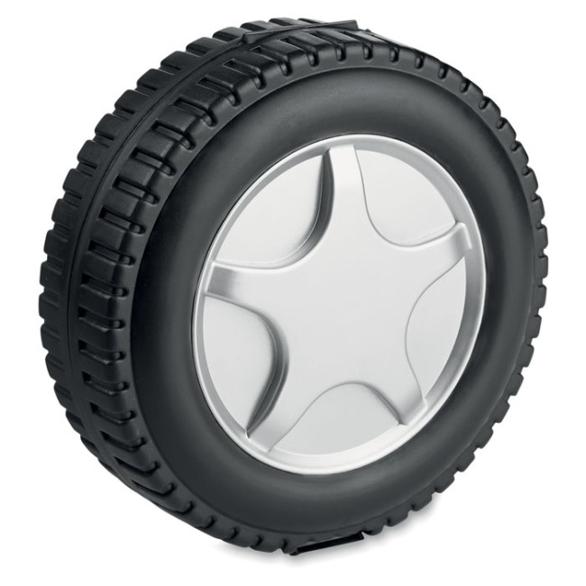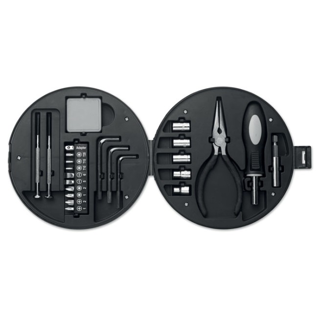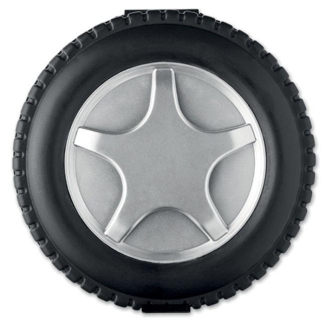 Set attrezzi 25 pezzi in confezione a forma di ruota. 1 prolunga, 1 cacciavite a bussola con 5 teste, 1 pinza ad ago, 3 chiavi a brugola, set 10 punte, 2 cacciaviti di precisione e 1 nastro adesivo.