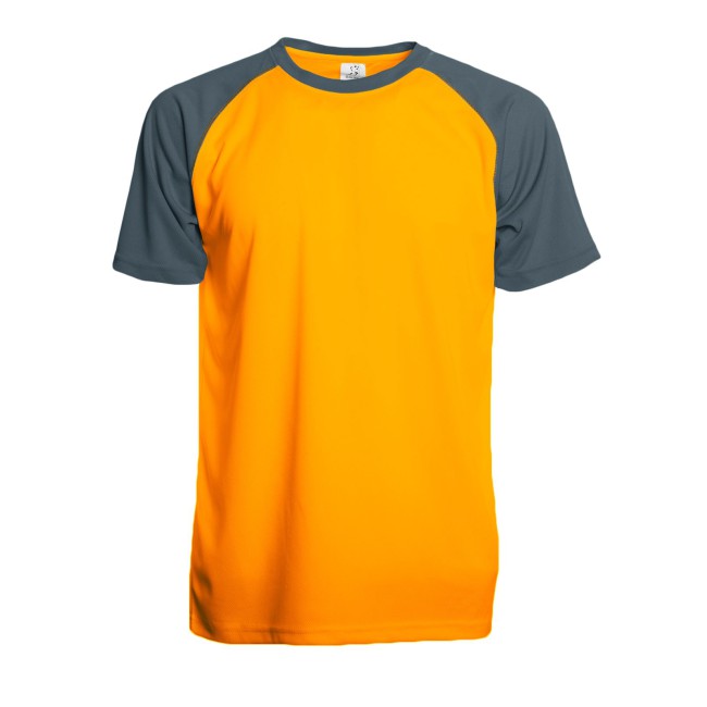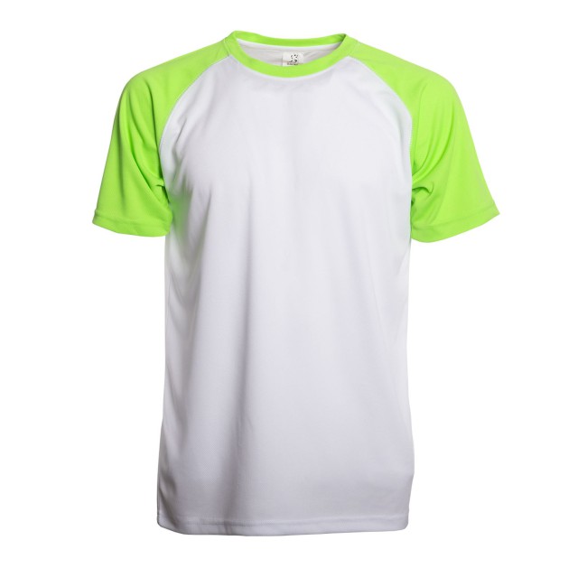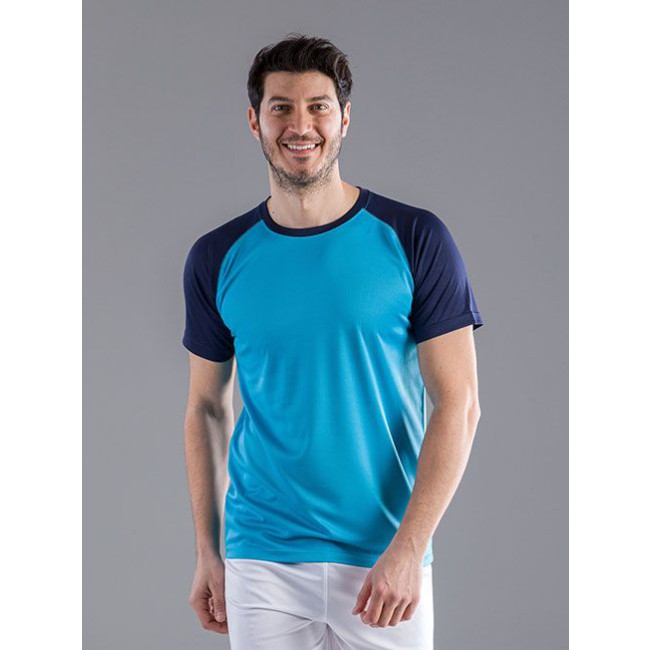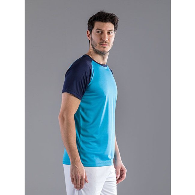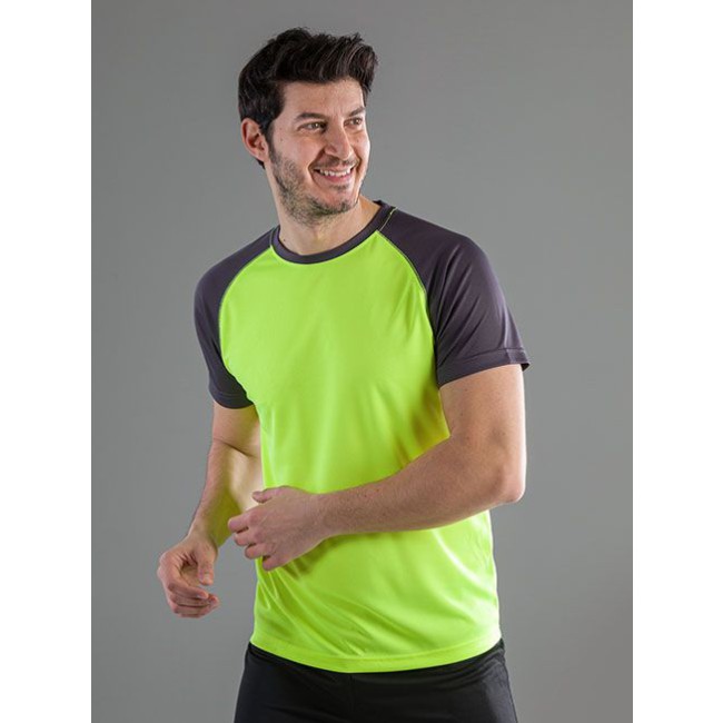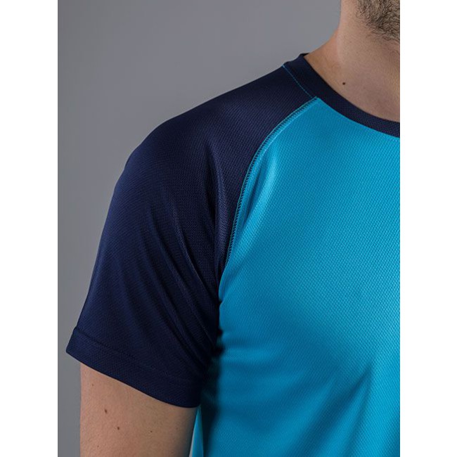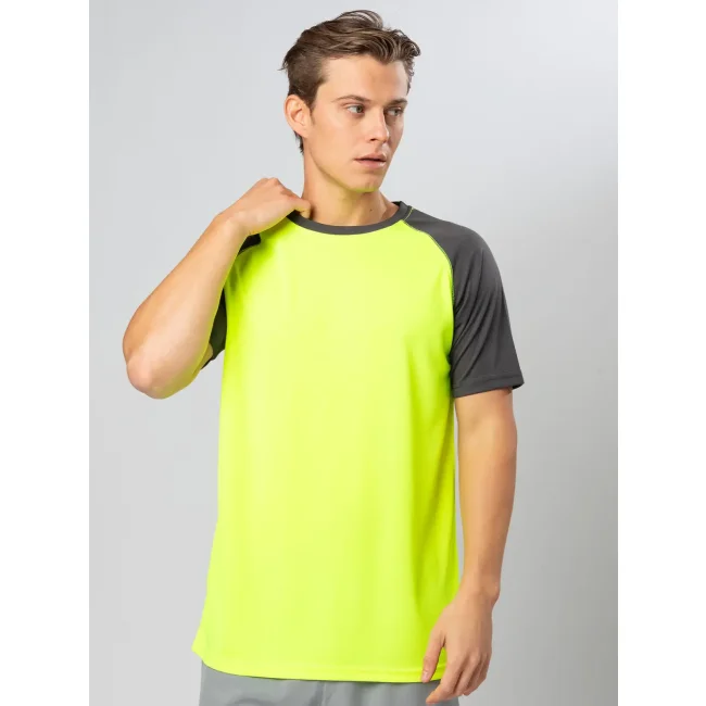 100% poliestere. T-shirt maniche corte raglan, girocollo di colore contrastante, cuciture flatlock per un maggiore comfort, struttura con cuciture laterali. Etichetta removibile.