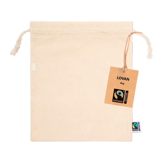Sacca della linea natura realizzata in cotone naturale con peso di 105g/m2. Certificata Fairtrade, questa sacca promuove un commercio solidale e sostenibile. Presenta una finitura cucita e una coulisse a chiusura automatica, con etichetta Fairtrade ed etichetta in cartone riciclato, rendendola un accessorio responsabile e pratico.