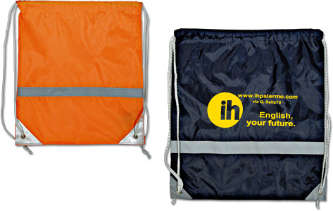 Sacca in nylon con lacci e rinforzi in metallo negli angoli, striscia catarinfrangente. Confezione in polybag.