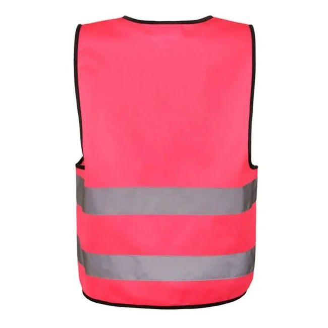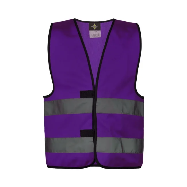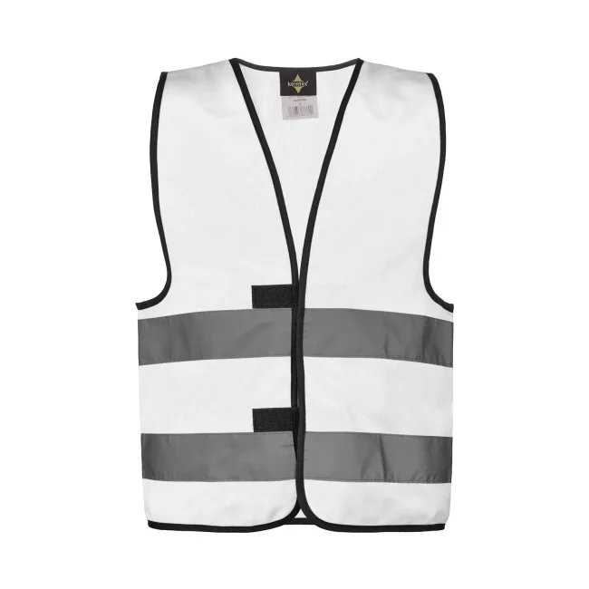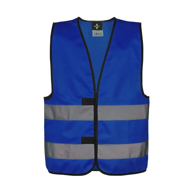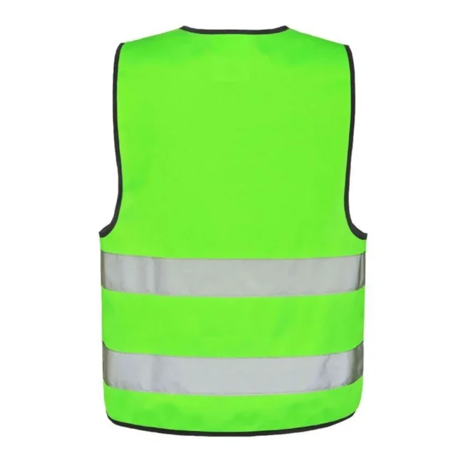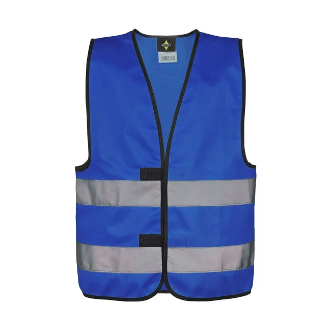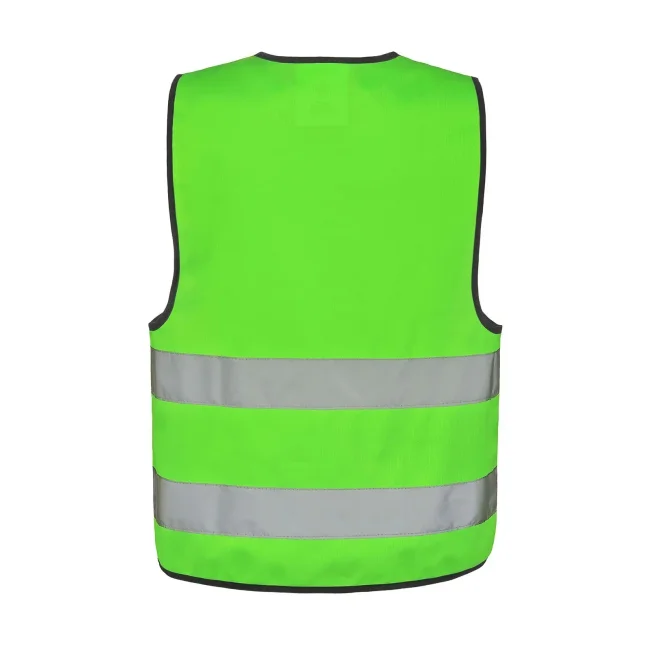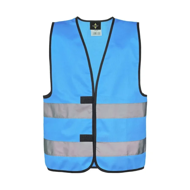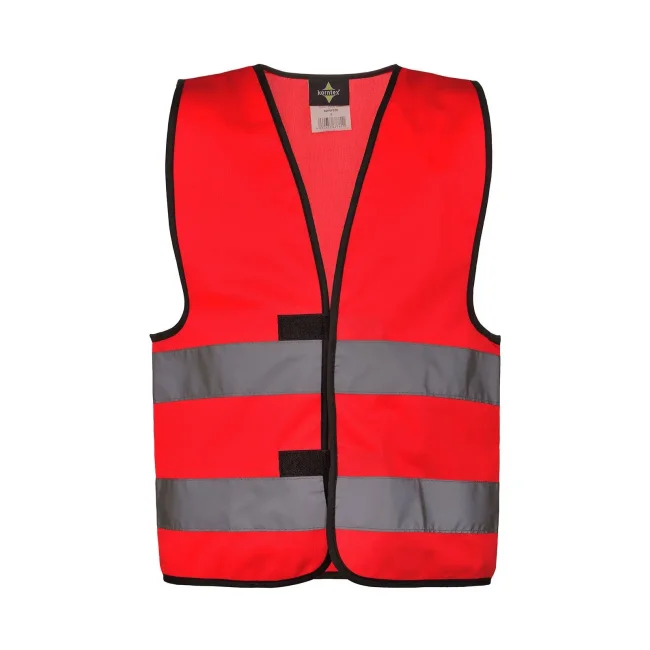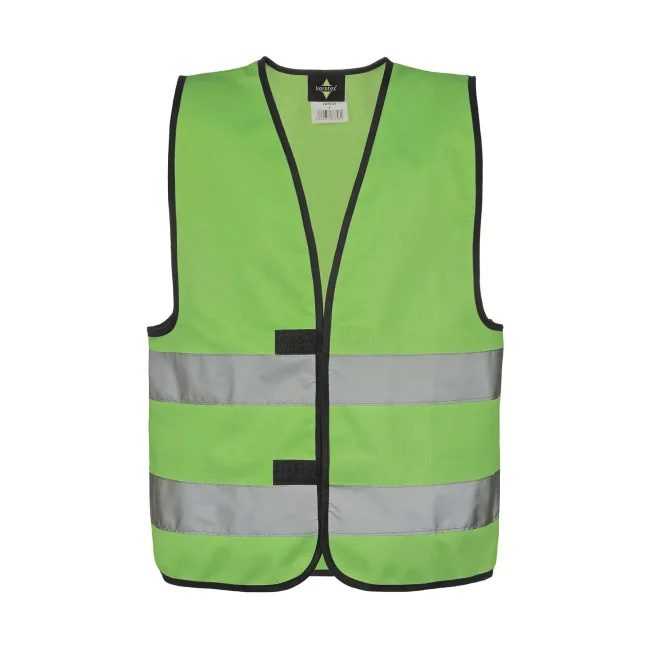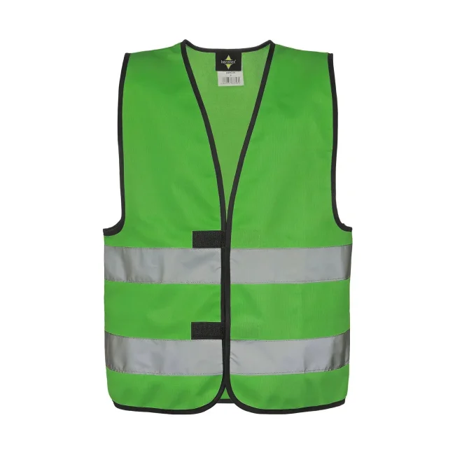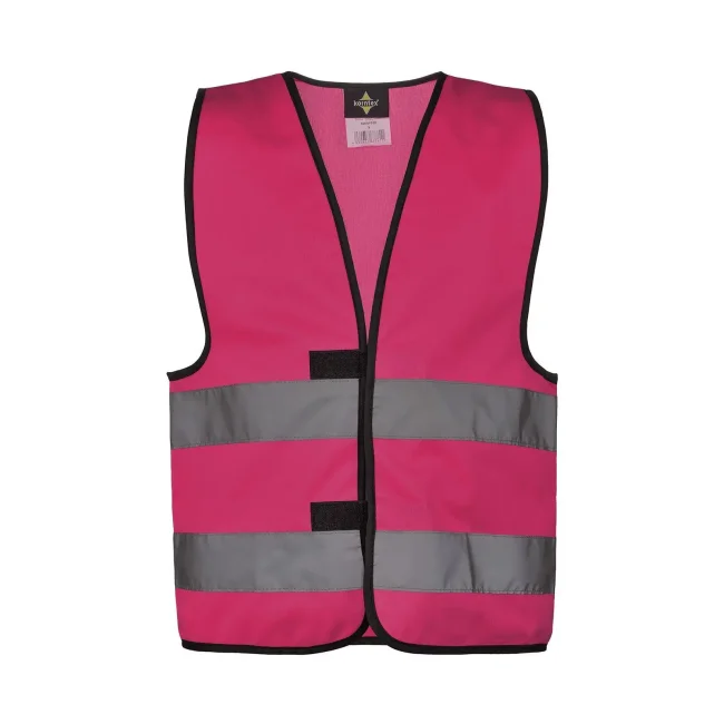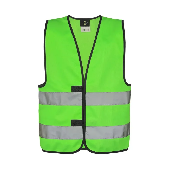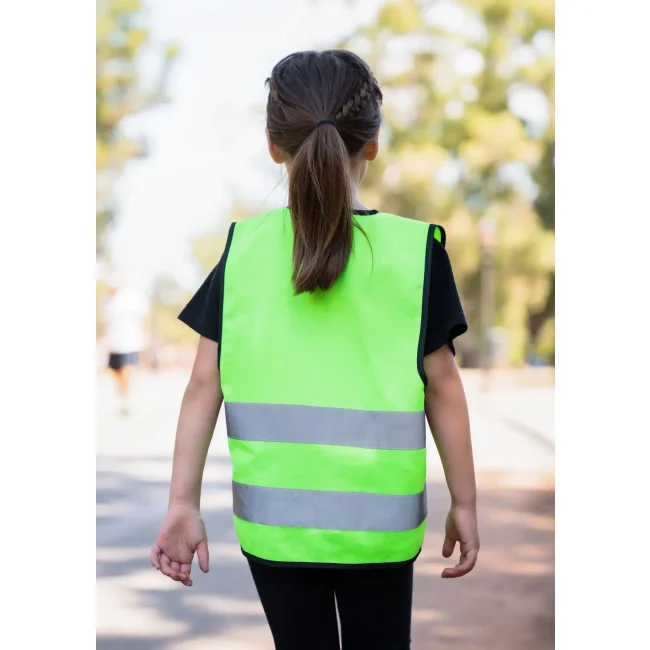 100% poliestere. Gilet di sicurezza per bambini. Due fasce riflettenti larghe 5 cm intorno al corpo, misura regolabile grazie alla doppia chiusura con velcro. Confezionato singolarmente in una pratica borsa in polietilene.