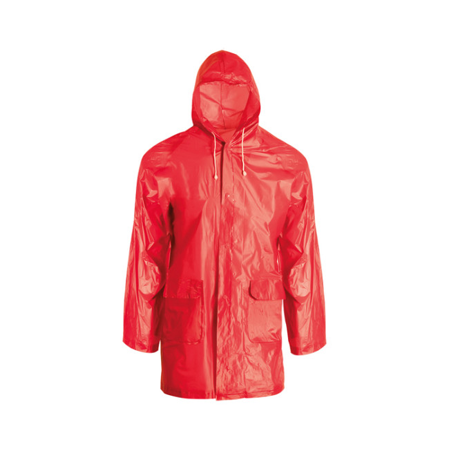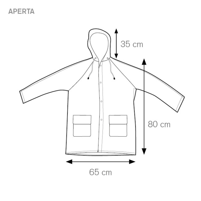 impermeabile goffrato con cappuccio chiusura con bottoni a pressione 2 tasche laterali corredato di pouch tecnica di stampa consigliata: serigrafica