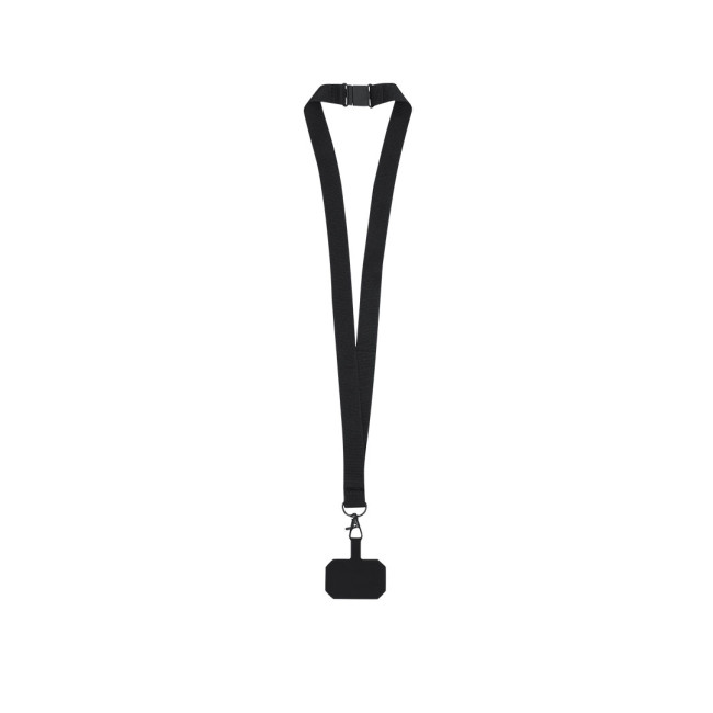 Lanyard originale in morbido poliestere, adattabile tramite l'accessorio di trasporto da posizionare tra la custodia e lo smartphone. Cintura di trasporto coordinata, moschettone girevole in metallo nero e dotato di accessorio di sicurezza per il collo.