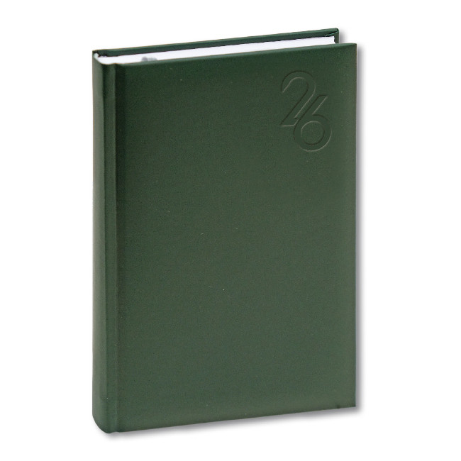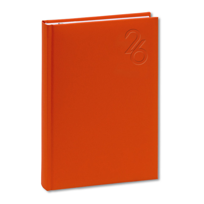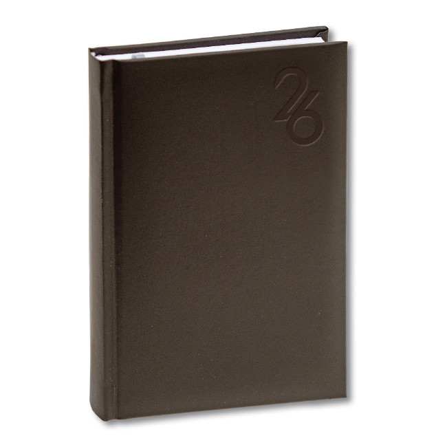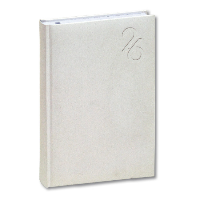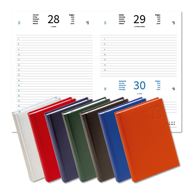Agenda giornaliera con sabato e domenica abbinati. Carta bianca certificata FSC da 60 gr, 320 pagine rubrica telefonica inclusa.