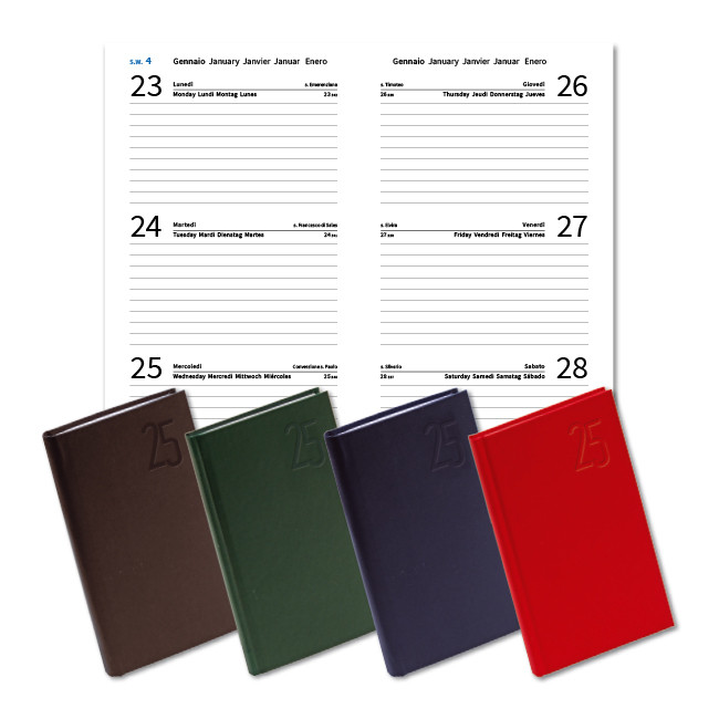 Agenda settimanale tascabile. Carta bianca certificata FSC da 60gr, 128 pagine.