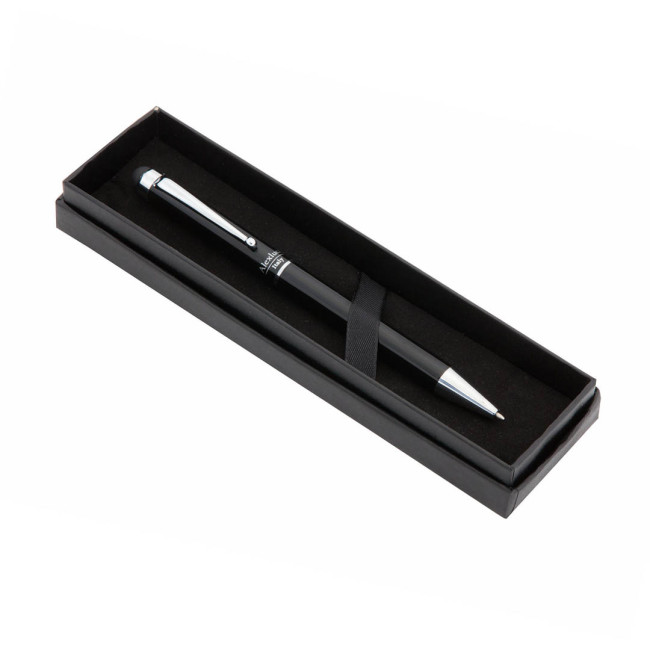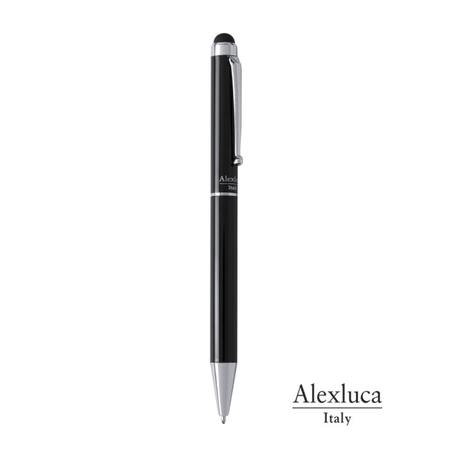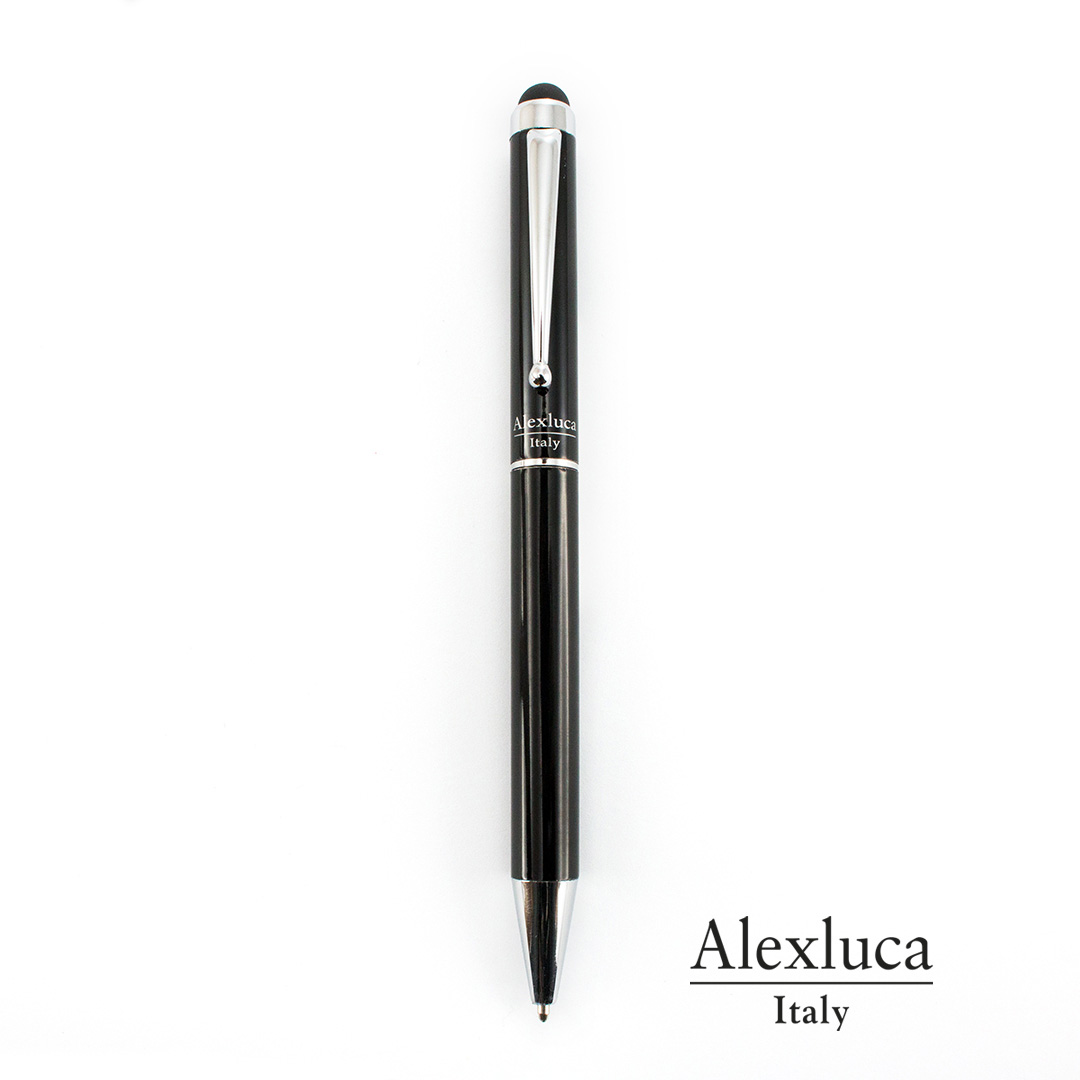 Penna Touch by Alexluca con meccanismo a rotazione, con fusto in metallo liscio in elegante nero. Clip e punta di design abbinati. Presentata in astuccio individuale nero con logo del marchio. Inchiostro blu.