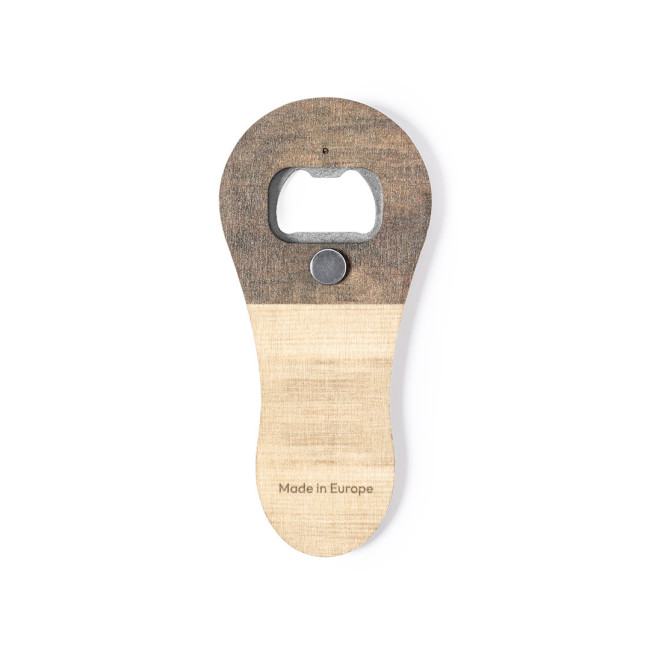 Apribottiglia magnetico in legno naturale con originale finitura bicolore. Con meccanismo di apertura in metallo, ampia superficie per la stampa e logo Made In Europe.