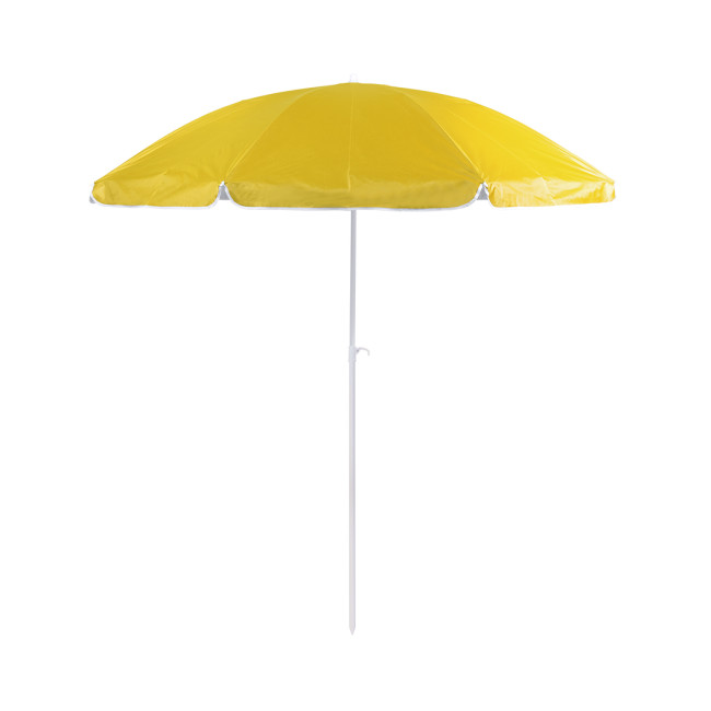 Ombrellone da spiaggia a 8 pannelli in nylon resistente. Interno grigio argento con protezione UV, con tubo telescopico inclinabile e regolabile in altezza. Diametro 200 cm, con gonne laterali, profili metallici bianchi e disponibile in un'ampia gamma di colori. Presentato in una custodia in nylon con tracolla.