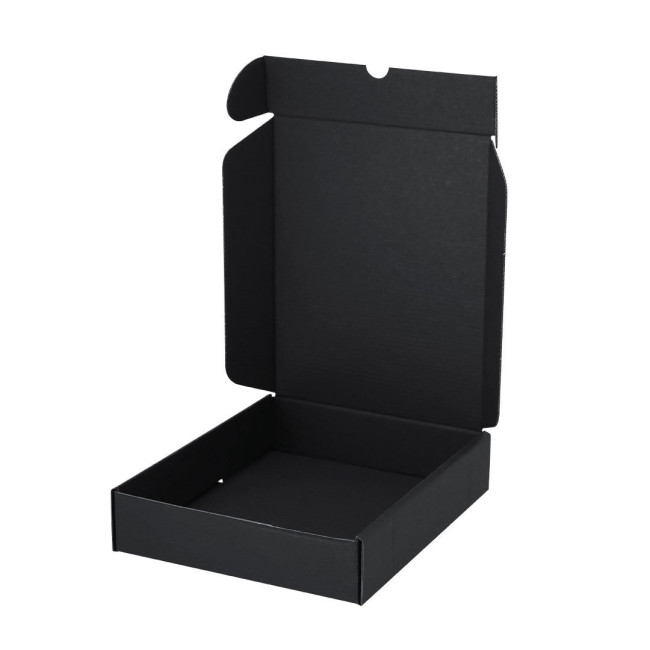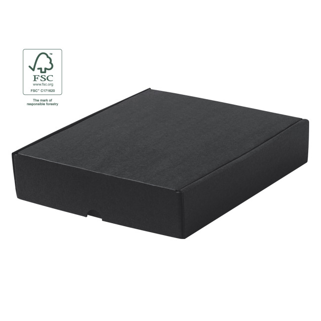 Scatola di presentazione di medie dimensioni realizzata in cartone ondulato di colore nero. In linea con la tendenza di mercato verso la sostenibilità, offre soluzioni per migliorare e conservare il nostro pianeta.
