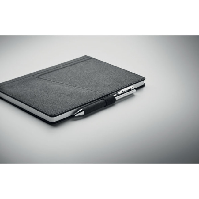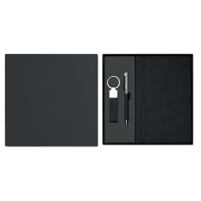 Set da 3 pezzi in confezione regalo. Comprende una penna a sfera a rotazione in metallo con dettagli in poliestere RPET, un taccuino con copertina rigida RPET con tasca frontale per smartphone e un portachiavi in poliestere RPET. Inchiostro blu. FSC MIX CREDIT | P7.1 | FSC-C213206