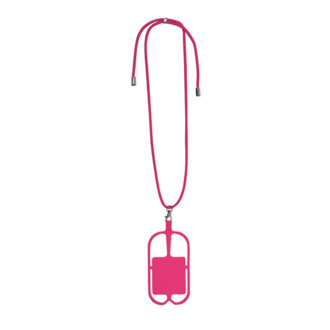 Originale lanyard per telefoni cellulari realizzato in resistente poliestere e silicone flessibile. Con accessorio di trasporto per tutti i tipi di smartphone, in grado di adattarsi a tutti gli schermi. Regolazione del collo e estremità del cordino con finitura cromata. Include un'ampia area di stampa. Disponibile in un'ampia gamma di colori.